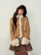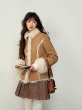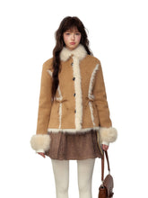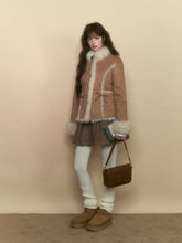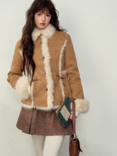 This stylish khaki shearling coat features a double-sided collar design for versatile styling and added warmth. The exterior uses a delicate faux fur finish that offers both visual and textural richness, while the environmentally friendly interior provides exceptional comfort. Tailored with a flattering silhouette and textured details, the coat enhances body proportions effortlessly, making it a sophisticated and practical winter staple.