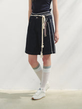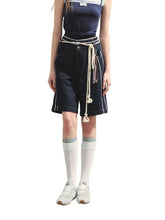 The double - waistband design makes wearing more novel and interesting. The original - color denim exudes a retro and trendy vibe, with a loose and casual style. The dark color is slimming and makes the skin look fairer. The light - blue polka - dot denim fabric features a playful three - dimensional polka - dot texture, like colorful candies accidentally洒落 by playful girls. The off - white drawstring and powder - blue knotted pendants are hand - crafted, with a colorful hue. The side seams are spliced with classic three - stripe lace decoration, giving a strong sporty feel. The brand - customized LOGO metal nodding button is highly decorative and symbolic. The five - point pants style offers free and comfortable wearing, with strong versatility.