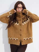 This Fair Isle knit sweater captures cozy winter charm with its soft wool-blend yarn and structured turn-down collar. The relaxed silhouette and intricate pattern switch add individuality and warmth, making it perfect for layering or standalone wear. Its soft texture offers both comfort and refined style for cold-weather outfits.