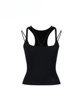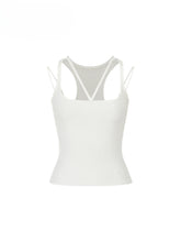 Deconstructed lines are integrated into the vest. Thick and thin shoulder straps reveal the skin and enrich the visual effect.