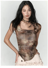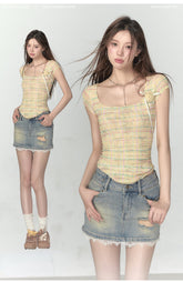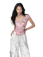 Pink & Yellow & Black Fitted Plaid Square Neck Top