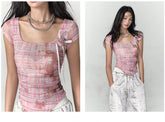 Product Name: Pink & Yellow & Black Fitted Plaid Square Neck Top