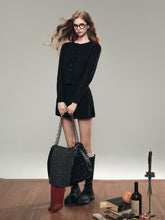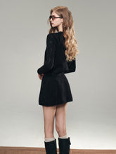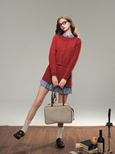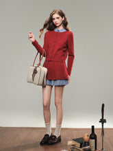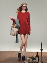 This 100% pure wool knit set features a deep galaxy red and tranquil black, providing a practical and stylish layering piece for colder days. The intricate hollow patterns and lace detailing showcase meticulous craftsmanship. The wide-waisted skirt offers a comfortable and flattering fit, while the structured knit combines elegance with warmth for the season. This soft and warm material brings a luxurious feeling throughout the entire outfit.