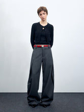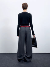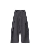These wide-leg trousers are crafted from a breathable wool-blend suiting fabric with a smooth, structured drape. The subtle curved-leg silhouette softens the tailored look while maintaining a clean, elongated line. Designed with a relaxed fit, pleated detailing, and refined pocket construction, the style balances comfort and polish for autumn and winter wear. Easy to pair with knits, shirts, or outerwear, this piece transitions effortlessly from casual to elevated styling.