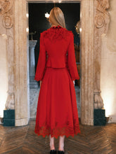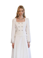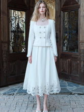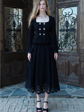 This stunning vintage-inspired set features a high-collar lace trim jacket and a waist-cinching skirt, adorned with crystal button details for added elegance. The design combines modern tailoring with classic flair, offering a flattering fit and timeless appeal. The skirt's voluminous silhouette and the jacket's tailored cut make it a versatile piece for formal and semi-formal events.