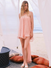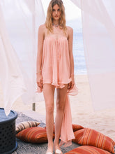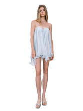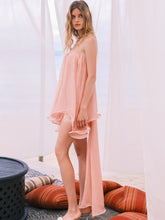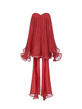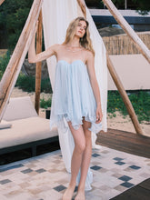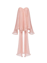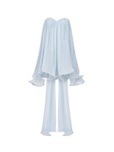 This elegant chiffon dress features a strapless bandeau design with flowing ribbons that add a whimsical and romantic touch. The dress is designed with pleated detailing and delicate lace, creating a soft, feminine silhouette. The lightweight fabric makes it ideal for warmer weather, perfect for outdoor events or summer evening outings.