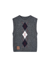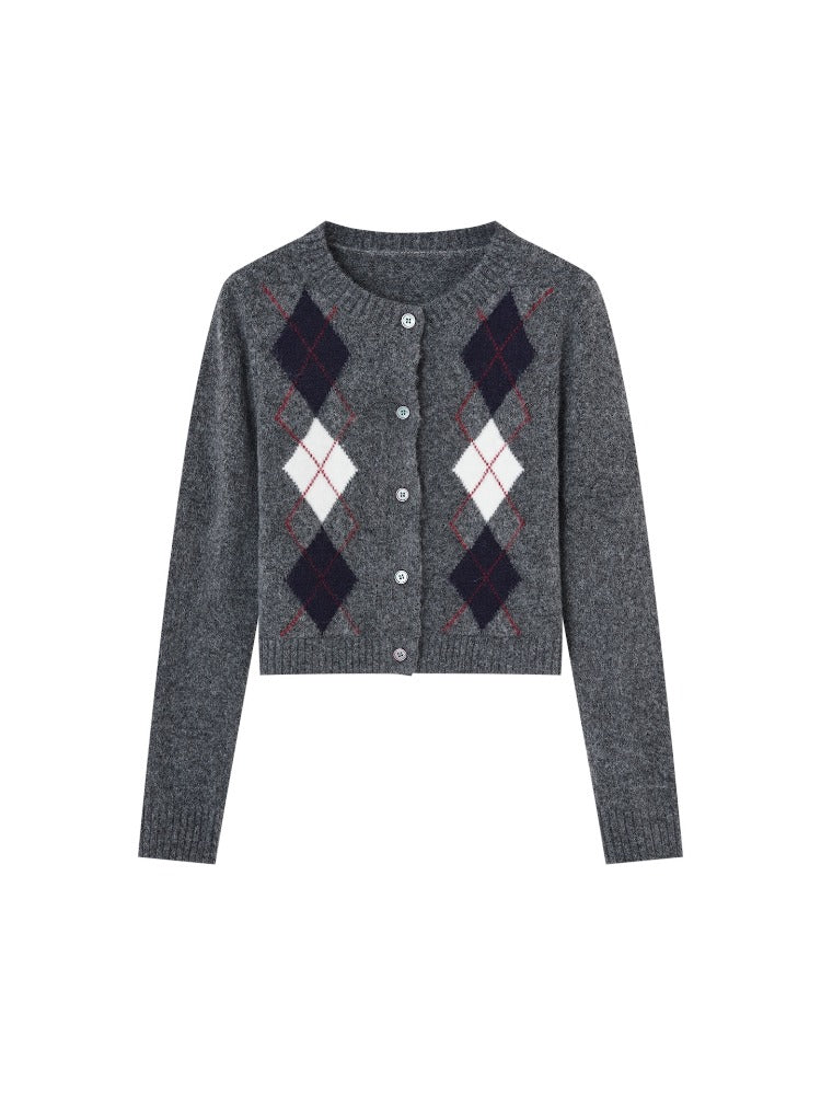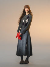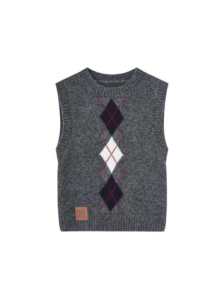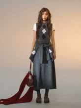 This coordinated set is crafted from two premium yarn blends for rich texture and dimension. The dark blue/red/white knit blend (42.6% acrylic, 30.7% polyester, 26.7% nylon) and the deep gray blend (62% acrylic, 33.7% polyester, 4.3% wool) provide a plush, cozy feel with durable stretch recovery. Featuring diamond quilting throughout, the vest, cardigan, and skirt can be styled together or separately for a versatile statement look. The soft-touch surface and structured knitting deliver both warmth and a refined silhouette ideal for autumn layering.