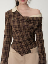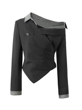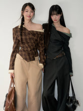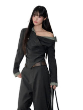 This Korean-inspired two-piece set features an asymmetric shoulder cropped blazer and matching wide-leg trousers. The waist-cinching tailored cut elongates body proportions, while irregular plaid patchwork adds depth and breaks traditional formality. Designed with subtle metallic pin details for a branded finish, it merges retro sophistication with modern casual style. Available in deep green tones for a sleek and versatile look, perfect for statement daily wear or semi-formal occasions.
