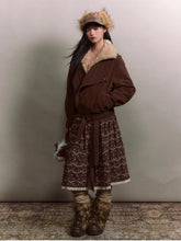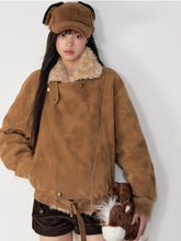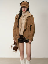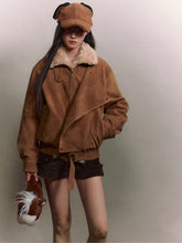 Crafted in a vintage-inspired moto silhouette, this jacket fuses rugged suede texture with plush faux shearling lining for ultimate winter comfort. The oversized lapel collar adds volume and character, while the wide cropped cut creates a flattering, easygoing proportion. Subtle washed treatment enhances the tactile depth and brings out a rich, mellow hue. Designed with practical details like concealed waist seams and adjustable cuffs, it strikes the perfect balance between structure and coziness. Ideal for styling with denim or mini skirts for an effortless modern-retro charm.