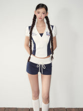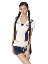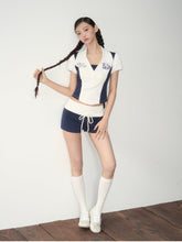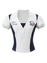 Inspired by sporty jersey aesthetics, this two-piece set features a structured polo top and drawstring shorts with contrast paneling. The A-line silhouette enhances the waistline, while the bold contrast piping and retro embroidered "55" add dynamic visual appeal. The layered top gives a sleek yet secure look, perfect for athletic or casual wear. A fashionable, comfortable outfit for sporty girls.