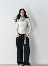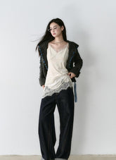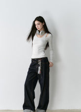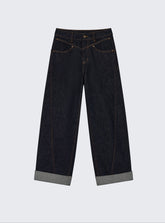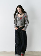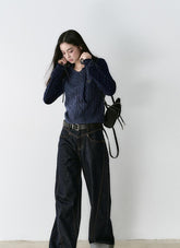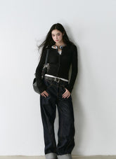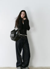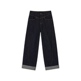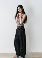 Crafted from premium vintage-dyed denim fabric, this piece is treated with eco-friendly pure indigo dye and sand-washing techniques to achieve a rich, deep color and clear texture, reminiscent of bamboo strips. The fabric is meticulously woven to ensure a uniform, layered texture that feels smooth against the skin. The dual-core fiber design ensures a snug and comfortable fit that accentuates your silhouette while providing stability. The denim's classic look is complemented by a turned hem and meticulous stitching, highlighting the garment's attention to detail and its suitability for both practical and street-style outfits.