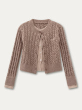 A soft and elegant knit cardigan that perfectly balances comfort and sophistication. Designed with a slightly cropped and fitted silhouette, it features a round neckline and delicate cable-knit texture for subtle layering detail. The detachable collar adds a preppy, vintage touch, while the structured inner lining enhances warmth and shape retention. Finished with tonal buttons and a minimal logo accent at the front, this piece pairs easily with both skirts and trousers, offering refined coziness for the autumn-winter season.