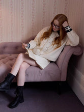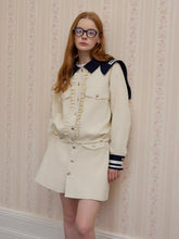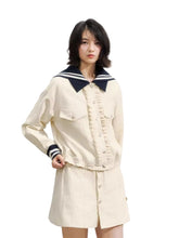 A revival of retro academic charm, this set blends deep navy with milky tones, highlighting a playful and structured silhouette. The jacket features a wide lapel sailor collar and military-inspired pocket placements, accented with refined symmetrical details for balance and sophistication. The cropped boxy cut pairs perfectly with the high-waisted mini skirt. Meticulously embellished with metal floral trims and layered button designs, this set merges discipline with vitality. Made from thick cotton for structure and softness, it's ideal for a spirited and styled autumn ensemble.