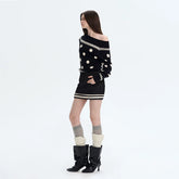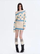 This off-shoulder knit dress is crafted from a merino wool blend that balances warmth with a soft, skin-friendly touch. The blue-and-white contrast pattern adds a vintage accent while highlighting clean lines across the neckline and sleeves. A fitted waist shapes the silhouette without restricting movement, creating a refined yet wearable profile. Designed as a statement piece for colder seasons, it transitions easily from daytime styling to evening looks.