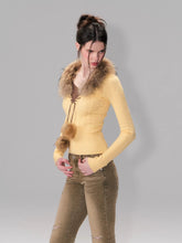Crafted from a soft blended knit, this top offers a smooth, comfortable hand feel with high elasticity for a flattering fit. Designed with a faux two-piece look, it features a detachable raccoon fur collar that adds warmth and texture while allowing flexible styling. The V-neckline elongates the neckline and enhances a slim silhouette, complemented by contrast detailing for added depth. Finished in a fitted profile with regular length, it works well as a layering base or a statement inner piece.