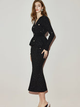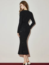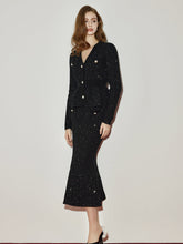 Classic V-neck design highlights and elongates the neckline beautifully.Unique bright plaid knitting shines subtly under the light, exuding elegance.Mermaid fishtail skirt enhances a retro-chic, sophisticated silhouette.Waistline with twisted pattern details adds structure and emphasizes body proportions.