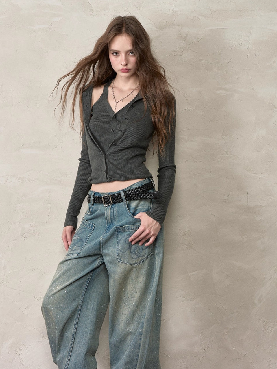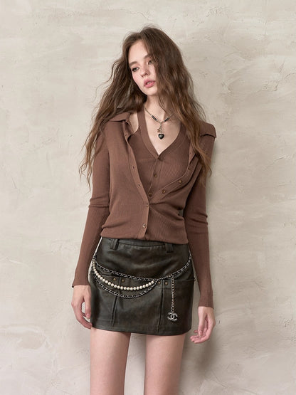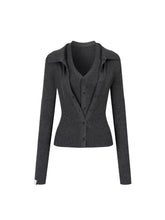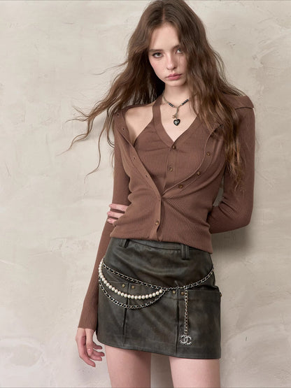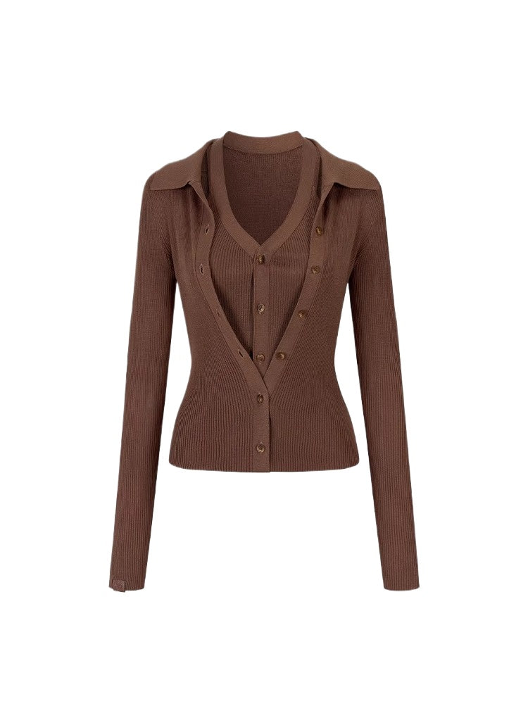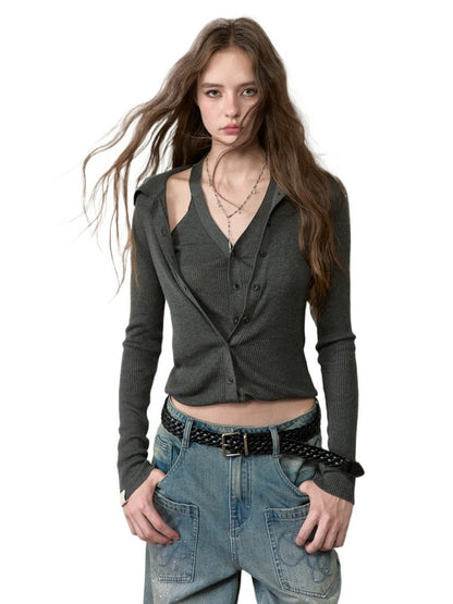 A faux two-piece design combines a camisole with a cardigan, enhanced by a layered placket for a playful visual effect. Ribbed texture adds contour and depth, creating a flattering silhouette that pairs effortlessly with different bottoms for versatile styling.