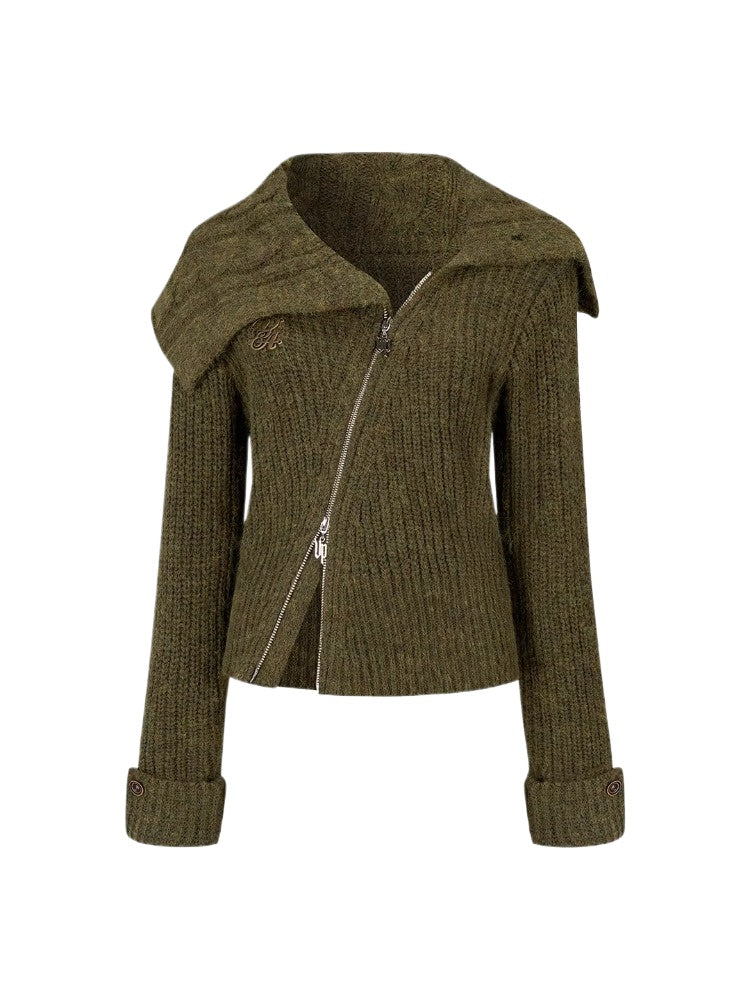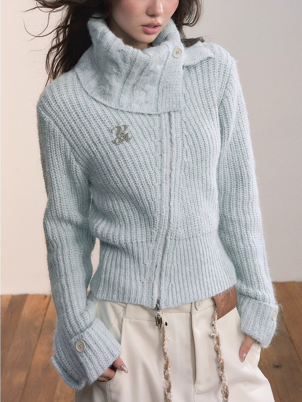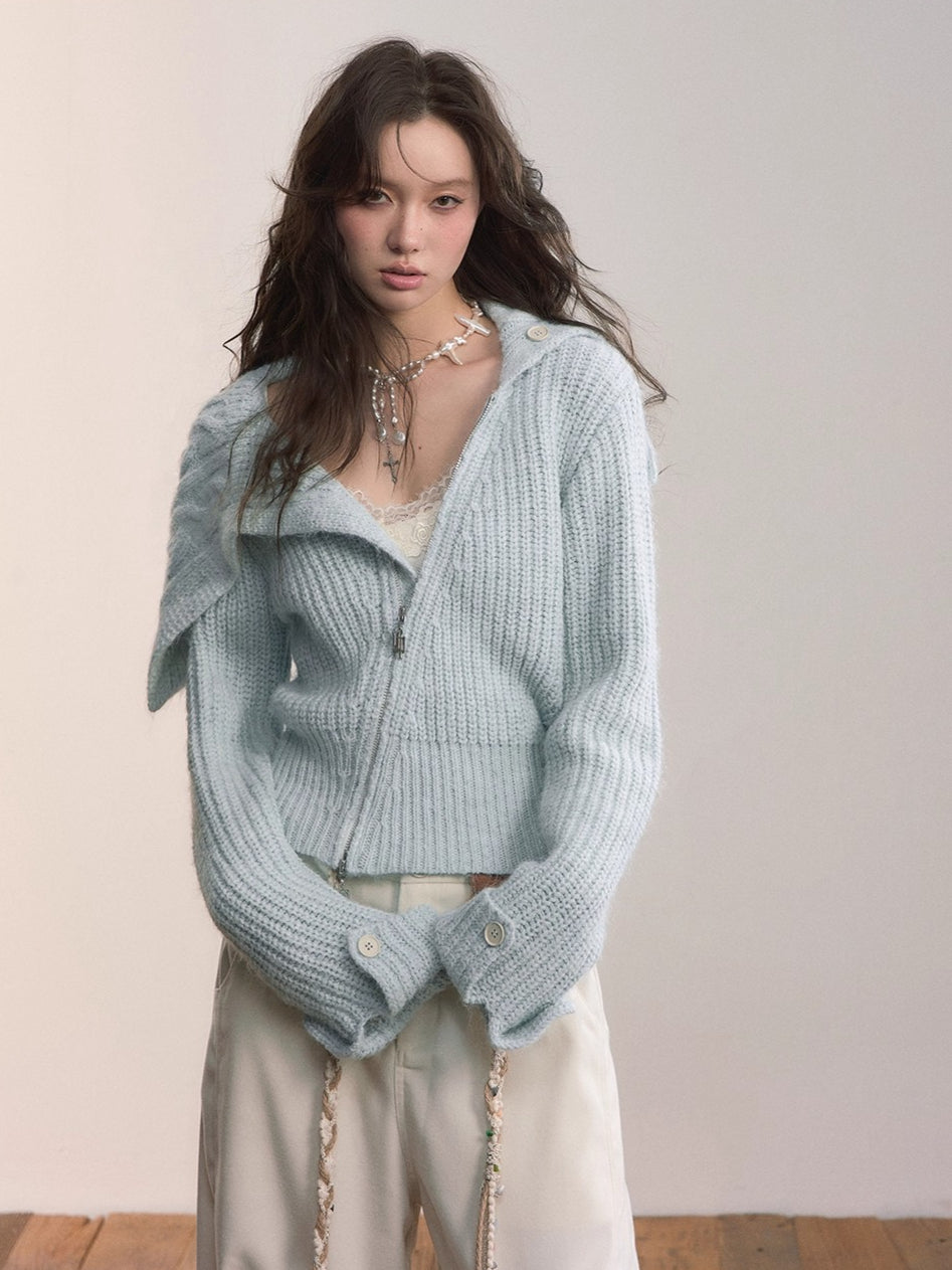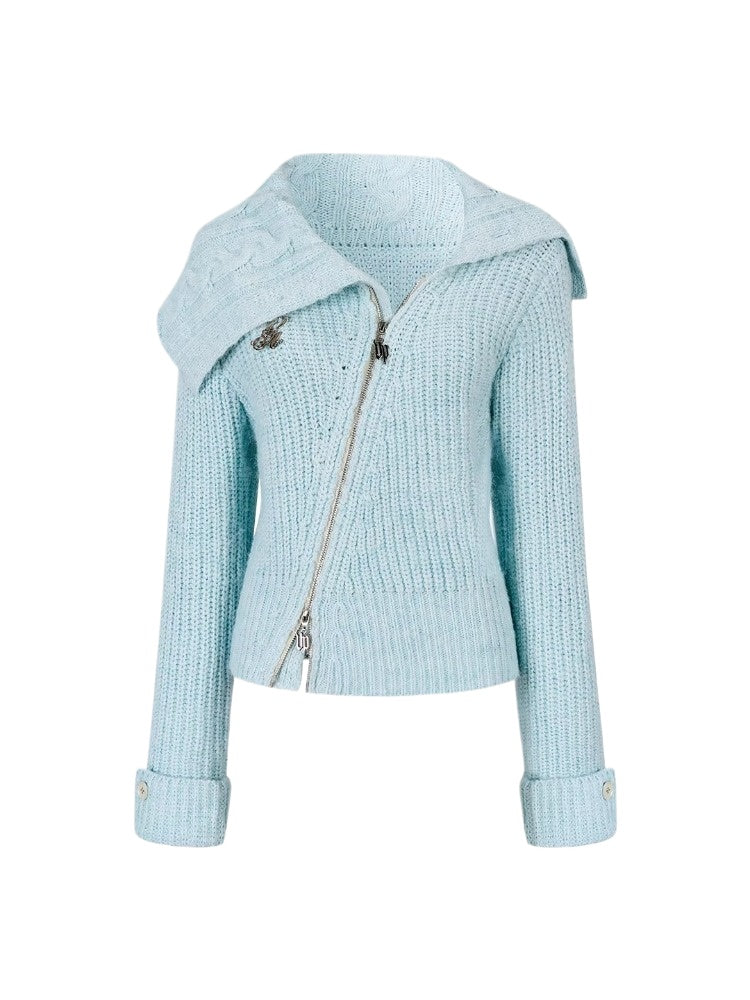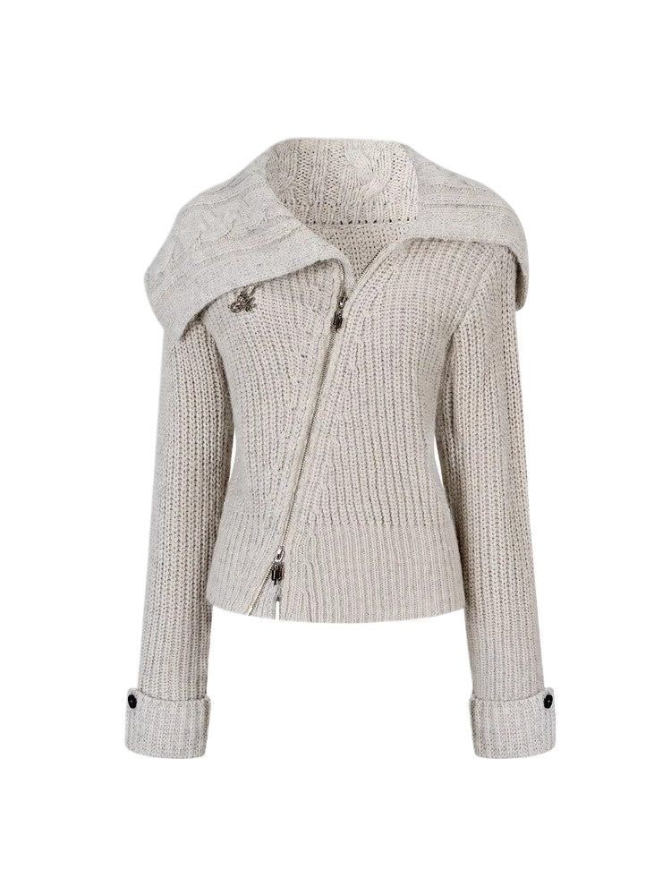 This cardigan features an oversized lapel blended into ribbed knitwear, accented with an asymmetrical double zipper for easy wear. Folded cuffs with button details add a playful touch, while the cropped fitted shape provides a flattering silhouette for autumn and winter styling.
