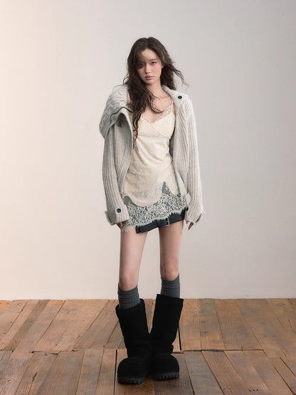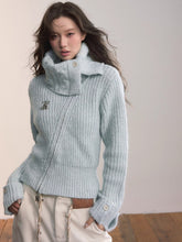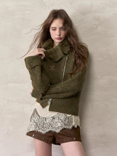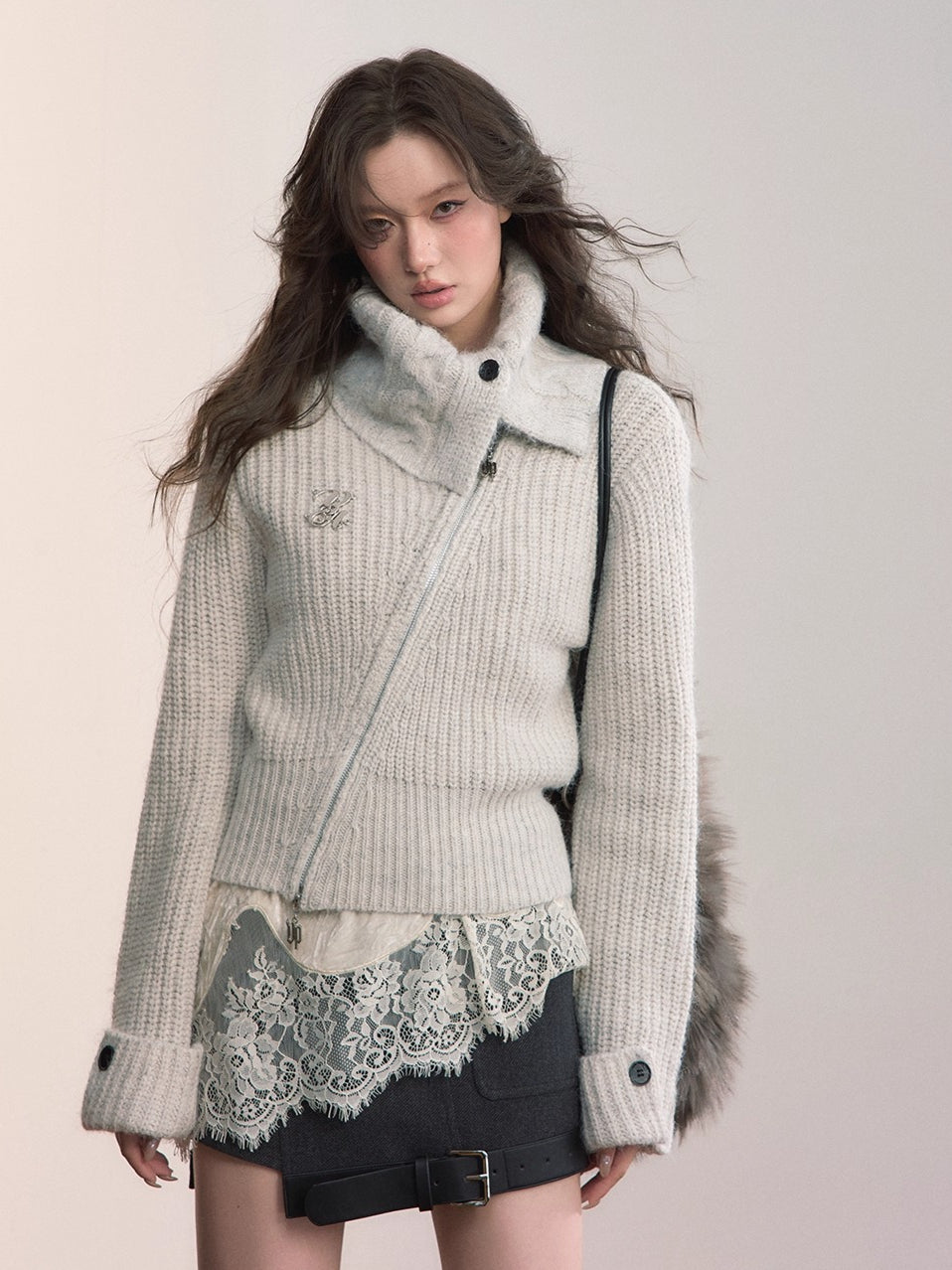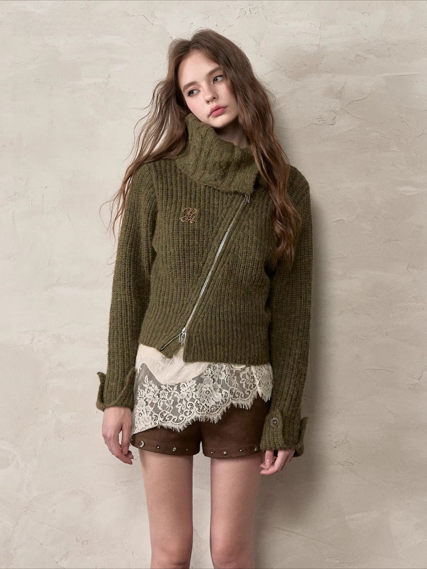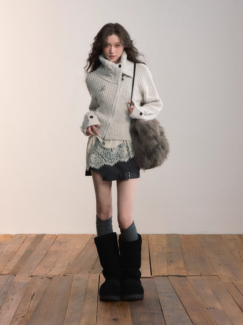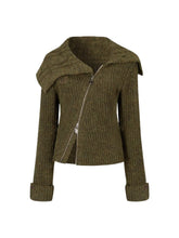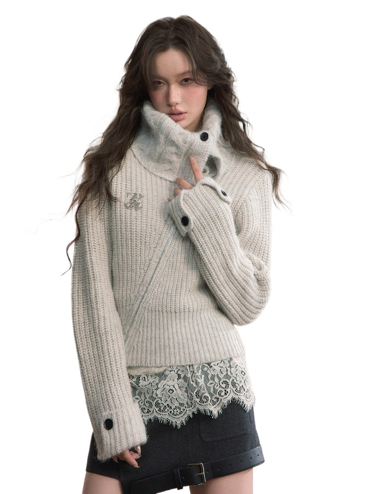 This cardigan features an oversized lapel blended into ribbed knitwear, accented with an asymmetrical double zipper for easy wear. Folded cuffs with button details add a playful touch, while the cropped fitted shape provides a flattering silhouette for autumn and winter styling.
