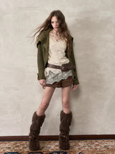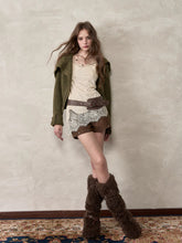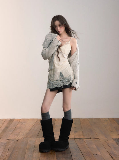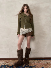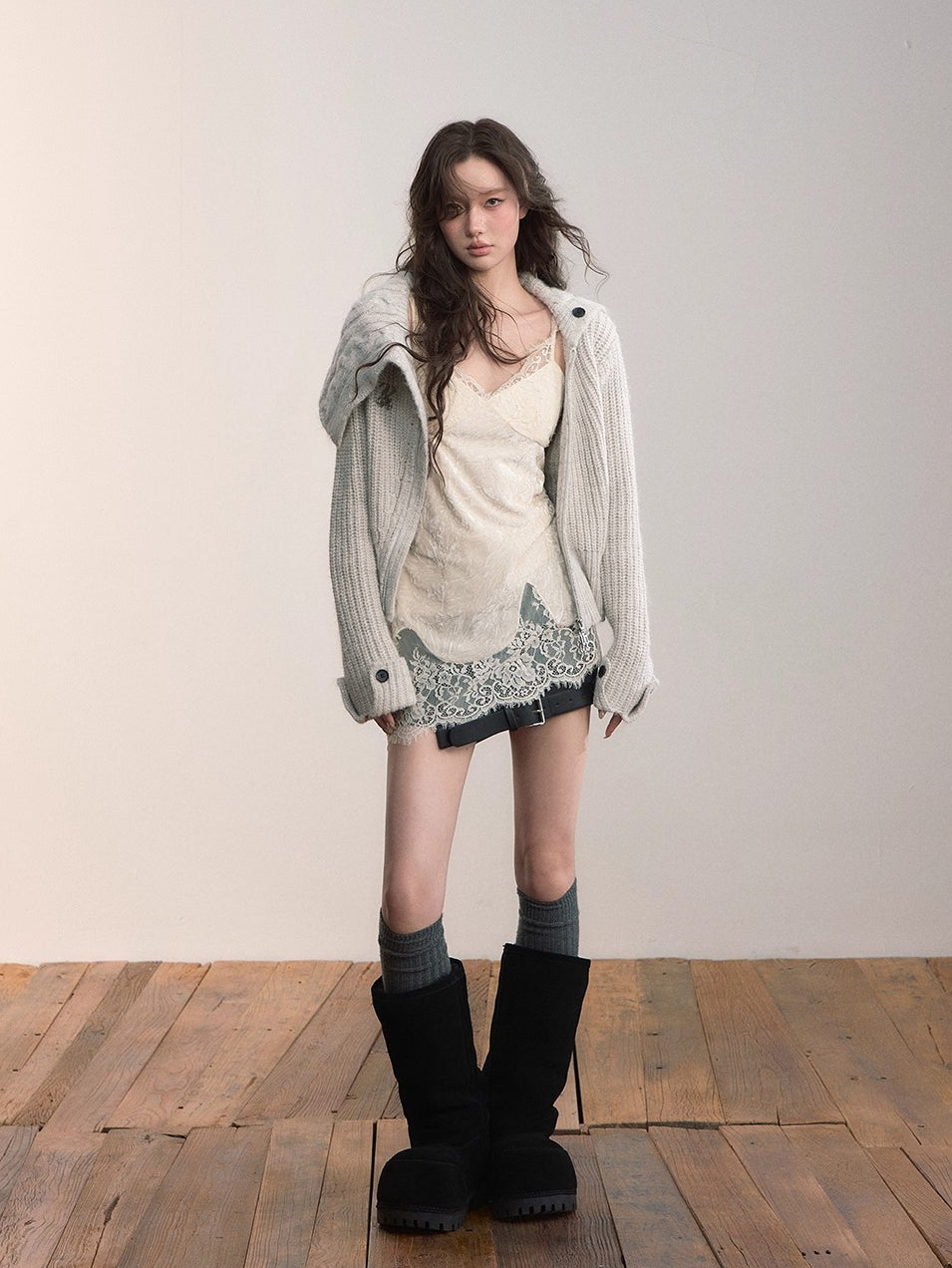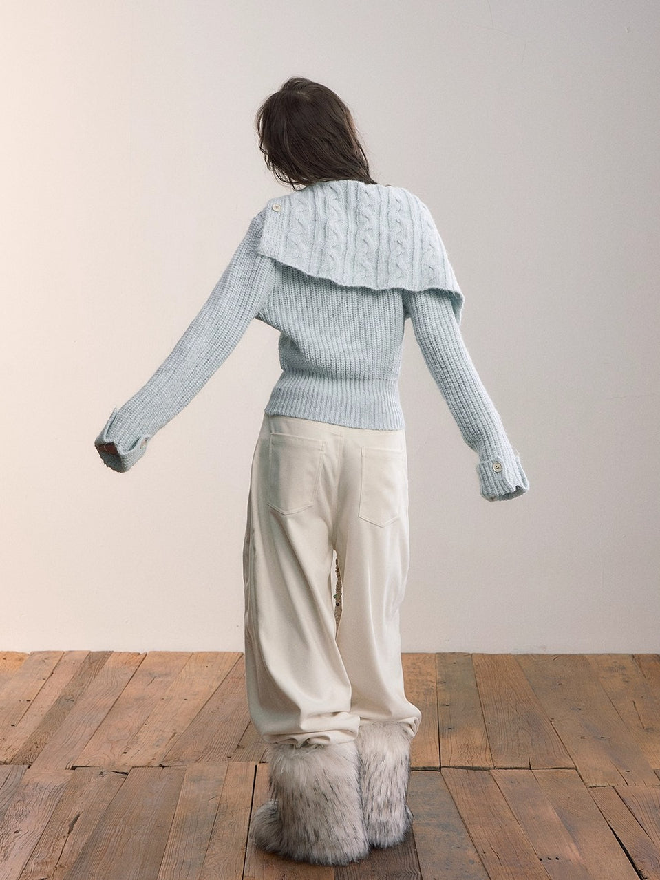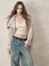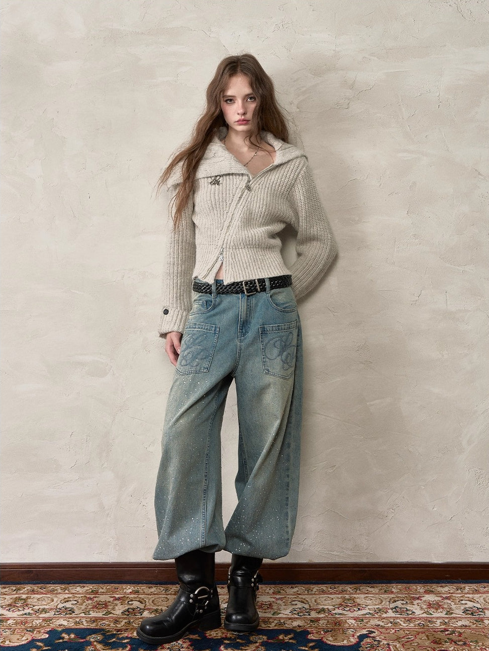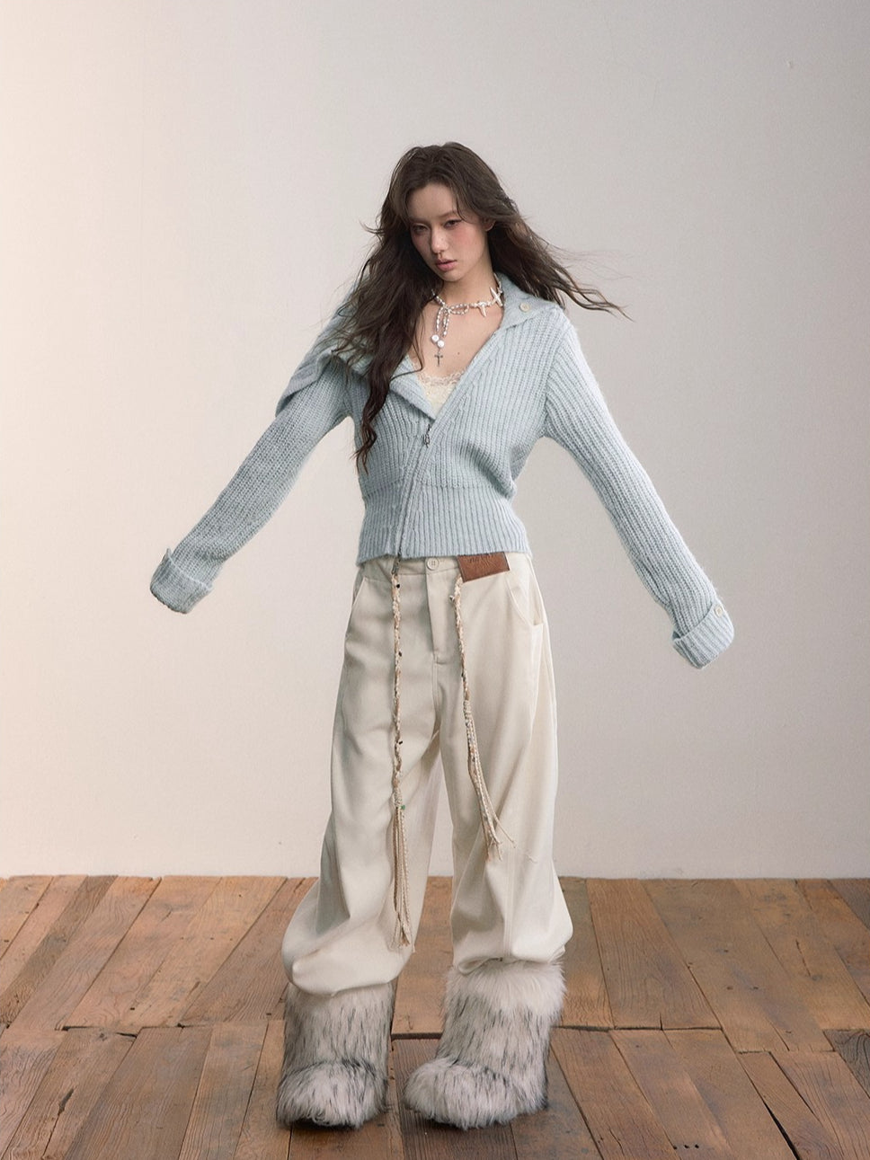 This cardigan features an oversized lapel blended into ribbed knitwear, accented with an asymmetrical double zipper for easy wear. Folded cuffs with button details add a playful touch, while the cropped fitted shape provides a flattering silhouette for autumn and winter styling.