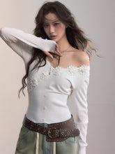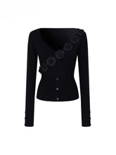 A fitted knit T-shirt designed with delicate 3D floral appliqués at the neckline for an elegant touch. The ribbed waist and vertical lines highlight the body’s natural curves while keeping a refined silhouette. Mid-weight with moderate stretch, offering versatility to pair with casual denim or layered under blazers for a chic autumn look.