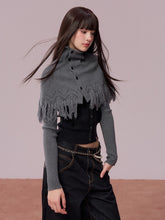 This fashionable two-piece set includes a stylish color-block high-neck knit top paired with a chic fringe cape. The top features a fitted design, while the cape offers a relaxed, free-flowing fit that adds a dramatic flair to the look. Crafted with a luxurious wool blend, the set provides both warmth and comfort. Perfect for layering in the fall and winter, this set can be dressed up or down for any occasion.