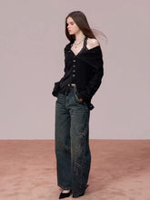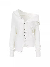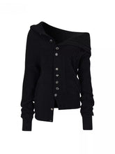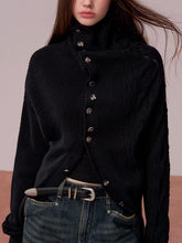 Crafted from a soft cotton-blend knit, this piece offers a balanced feel of structure and comfort for seasonal wear. The convertible high collar can be styled as a bold folded neckline or worn loose for an asymmetrical, off-shoulder look. Designed in a relaxed silhouette with textured knit detailing and button closure, it creates visual depth while remaining easy to layer. Ideal for spring styling over denim or skirts for an effortlessly edgy outfit.