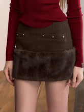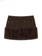 A structured wool-blend body meets plush faux-fur paneling for a rich winter texture and warmth. The clean straight silhouette sits at mid waist and finishes in a modern mini length. Symmetric patch-pocket details and subtle studs add a sharp, street-ready accent while keeping the look polished. Pair it with tonal knits or a tailored jacket for campus, commute, and nights out.
