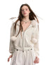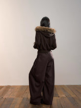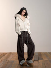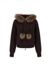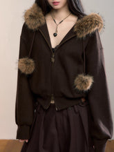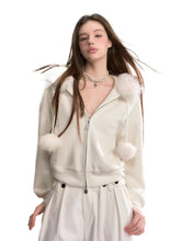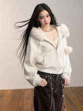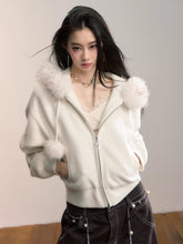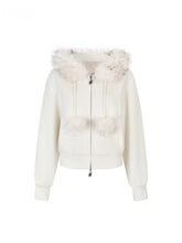 This sweatshirt is cut from a plush wool-blend fleece with a smooth polyester face, creating a dense yet soft handfeel that traps warmth. Fluffy faux-fur pom-poms at the hood and a cosy hooded collar add playful texture, while the slightly cropped, nipped-in hem shapes a neat waistline. Wear it with wide-leg trousers for relaxed street looks or throw it over pleated skirts and dresses for a softer winter outfit. A double-ended front zipper makes it easy to adjust ventilation and styling, and the roomy fit allows comfortable layering without feeling bulky.
