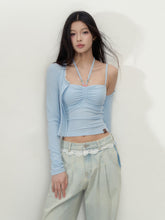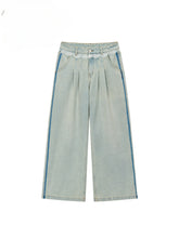 Denim long pants with faux leather lace elements, creating a relaxed attitude and giving off a youthful vibe.