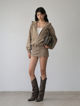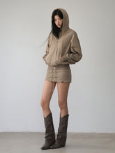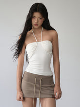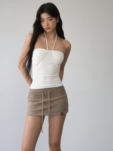 The sweat skirt features three-dimensional tailoring for a short, body-con fit. The extended ribbed elastic waist collides with the drawstring element.