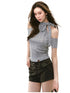 This vest incorporates versatile cross-wear styling, showcasing a chic one-shoulder design with a rich texture. Perfect for adding a fashionable edge to your look.