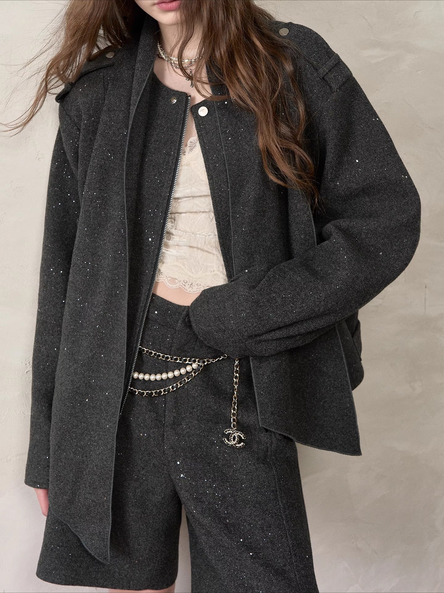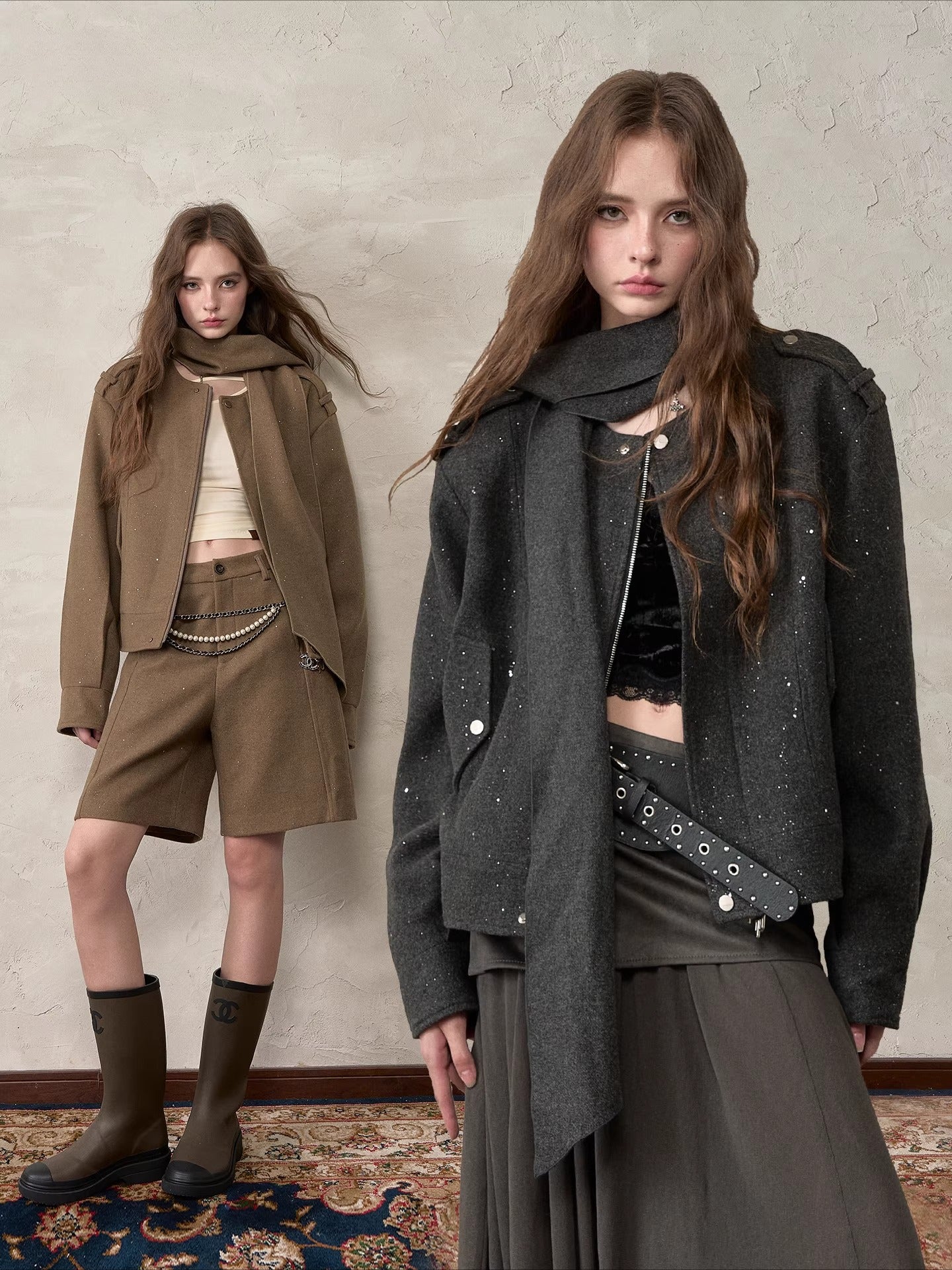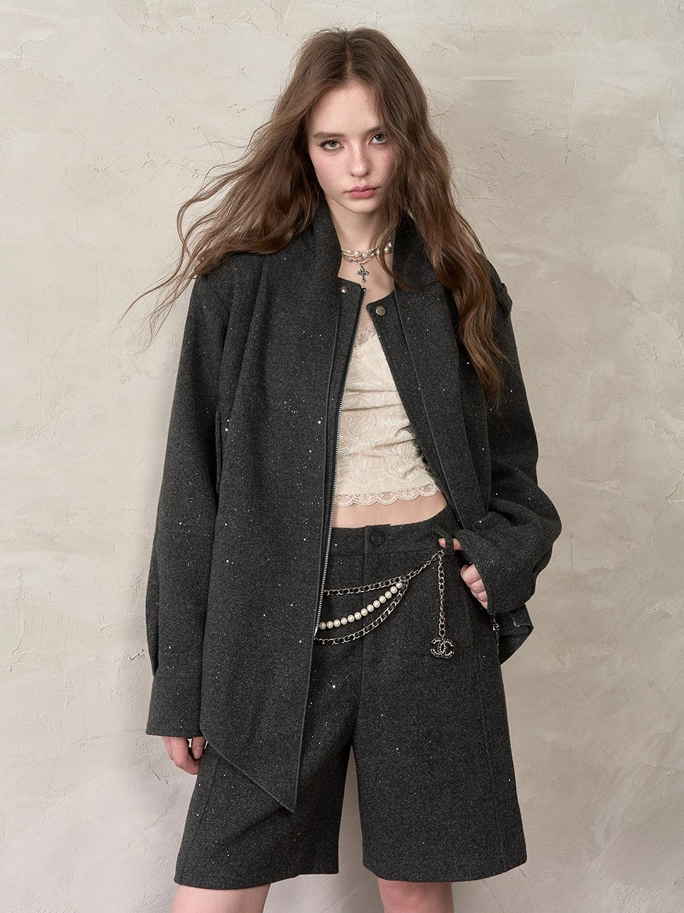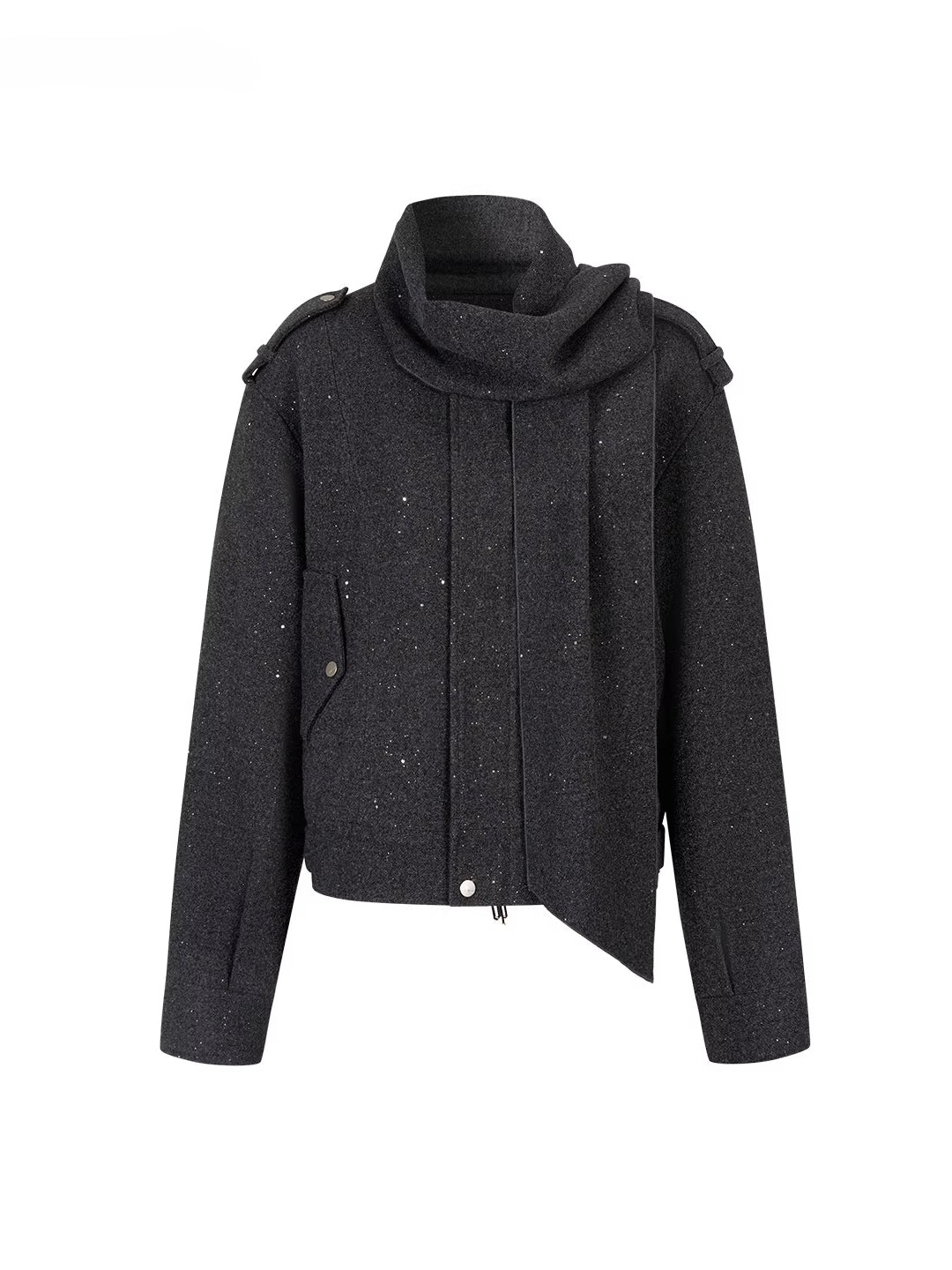 A relaxed-fit jacket featuring scarf details for effortless styling. Scattered silver embellishments create a subtle shimmering effect, balancing casual elegance with versatile autumn-winter appeal.
