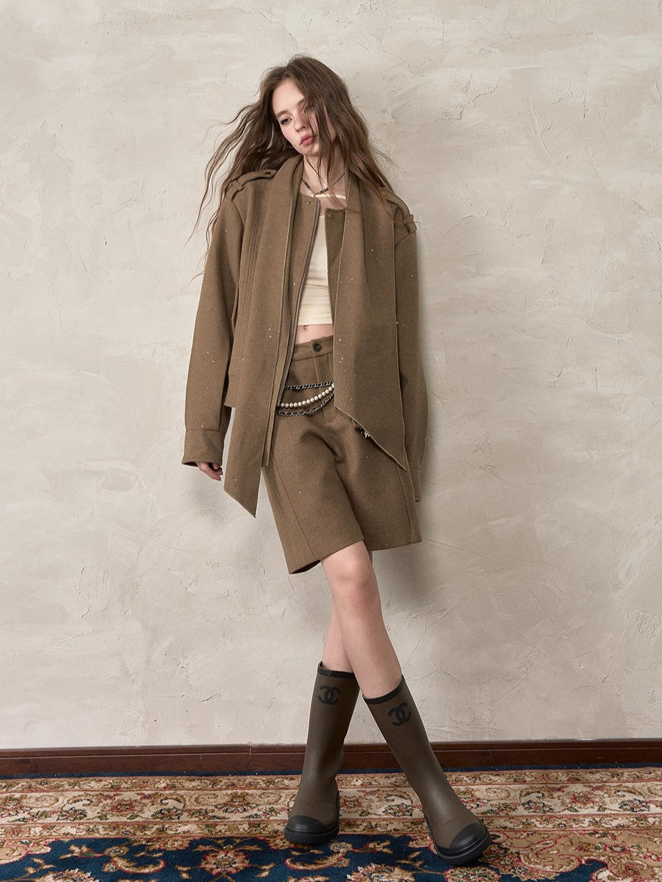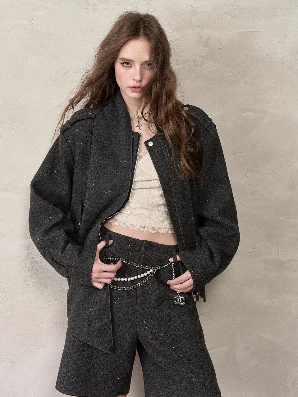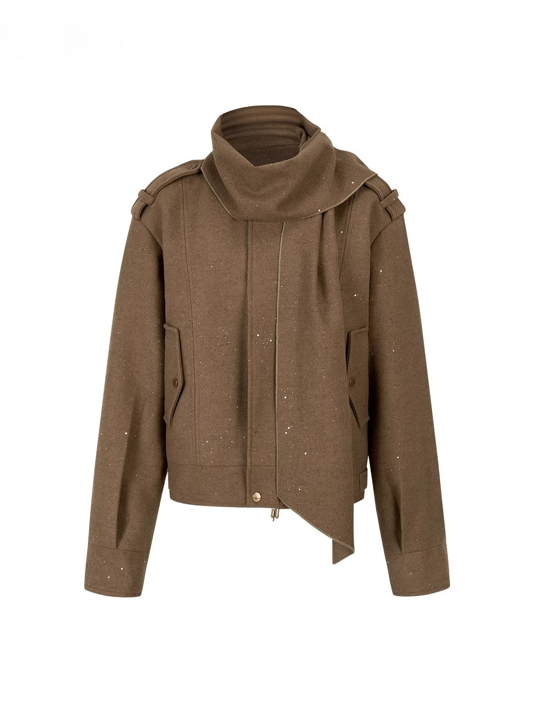 A relaxed-fit jacket featuring scarf details for effortless styling. Scattered silver embellishments create a subtle shimmering effect, balancing casual elegance with versatile autumn-winter appeal.