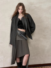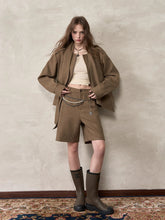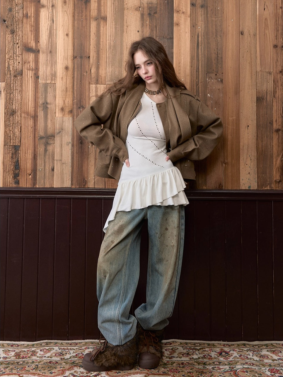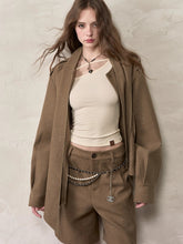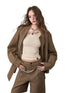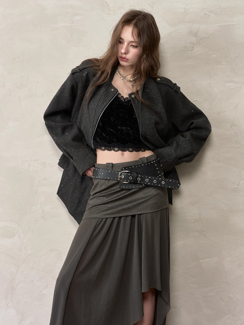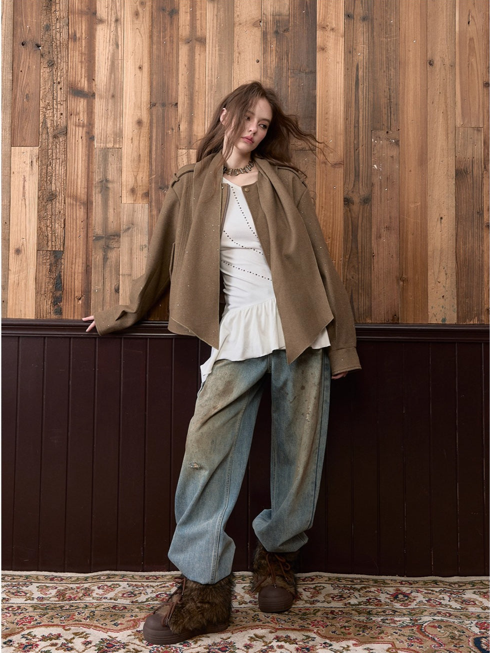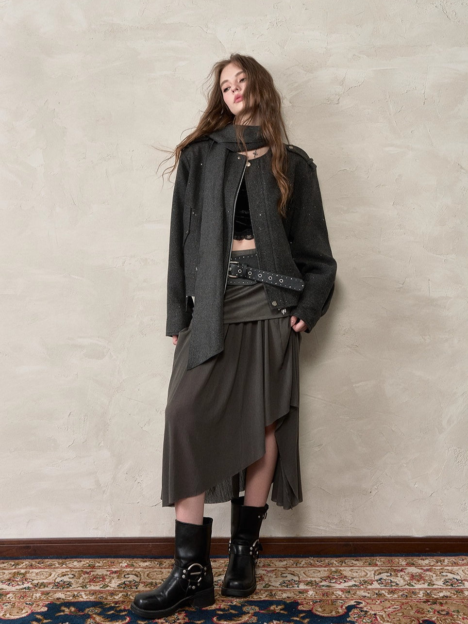 A relaxed-fit jacket featuring scarf details for effortless styling. Scattered silver embellishments create a subtle shimmering effect, balancing casual elegance with versatile autumn-winter appeal.