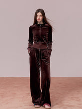 This two-piece velvet sports set includes a cozy hoodie and matching wide-leg pants, perfect for a relaxed and stylish look. The hoodie features a full-length zip closure with adjustable drawstrings, while the pants offer a comfortable fit with an elastic waistband. Crafted from a soft velvet material, this set combines both comfort and style, making it ideal for casual outings, lounging, or light workouts during the colder months.