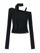 This asymmetric shoulder T-shirt features a stylish neck tie that adds charm and sophistication. Its slim-fit design gracefully wraps around the body, enhancing natural curves. The blend of high-quality wool provides warmth and comfort, making it a versatile piece for casual or semi-formal wear. Perfectly pairs with various bottoms to create fresh and trendy looks for the season.