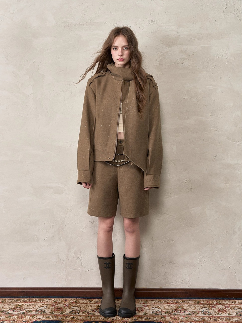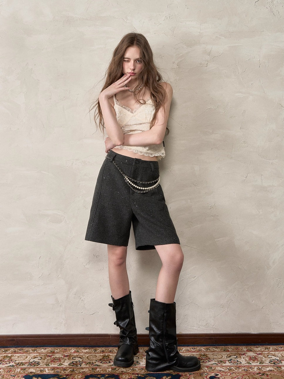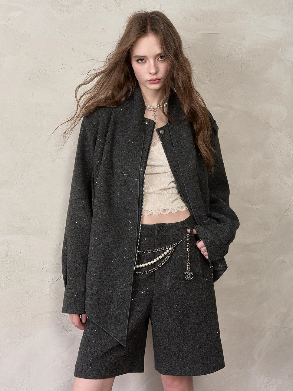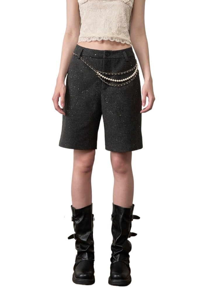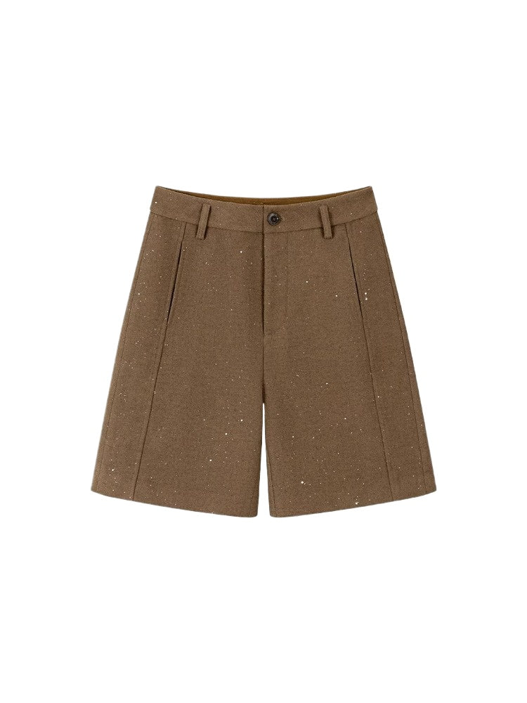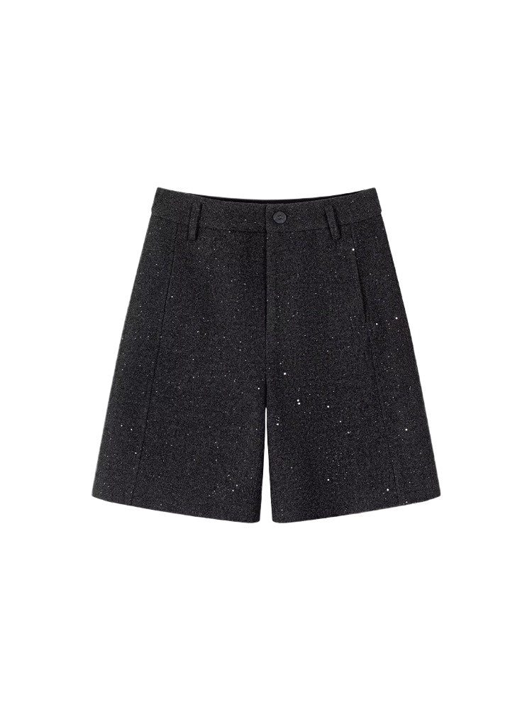 Designed with a relaxed silhouette, these mid-length shorts feature irregular silver speckle embellishments that add a sparkling accent. The clean tailored cut brings structure, while the wool blend fabric balances warmth with effortless casual charm.