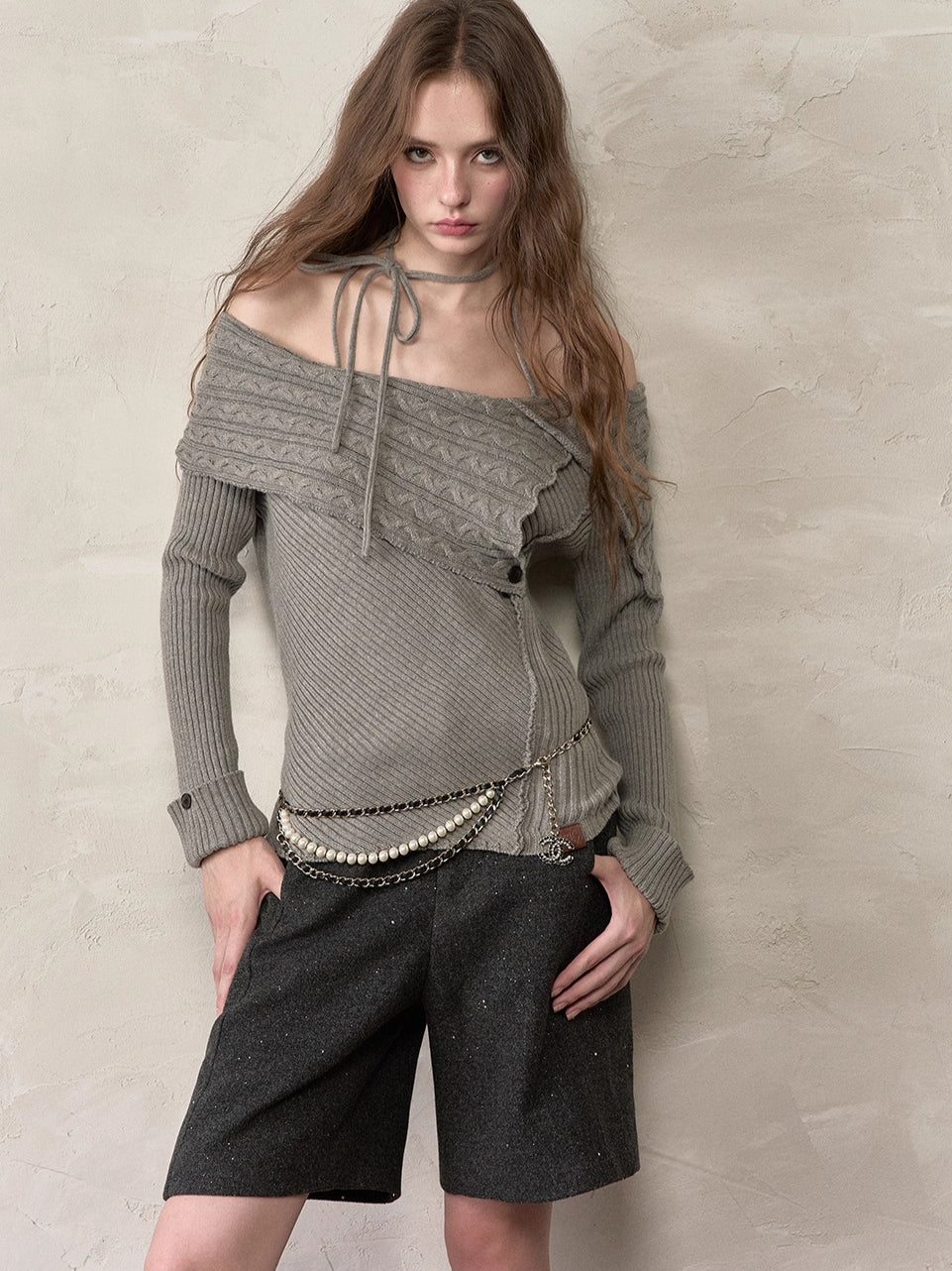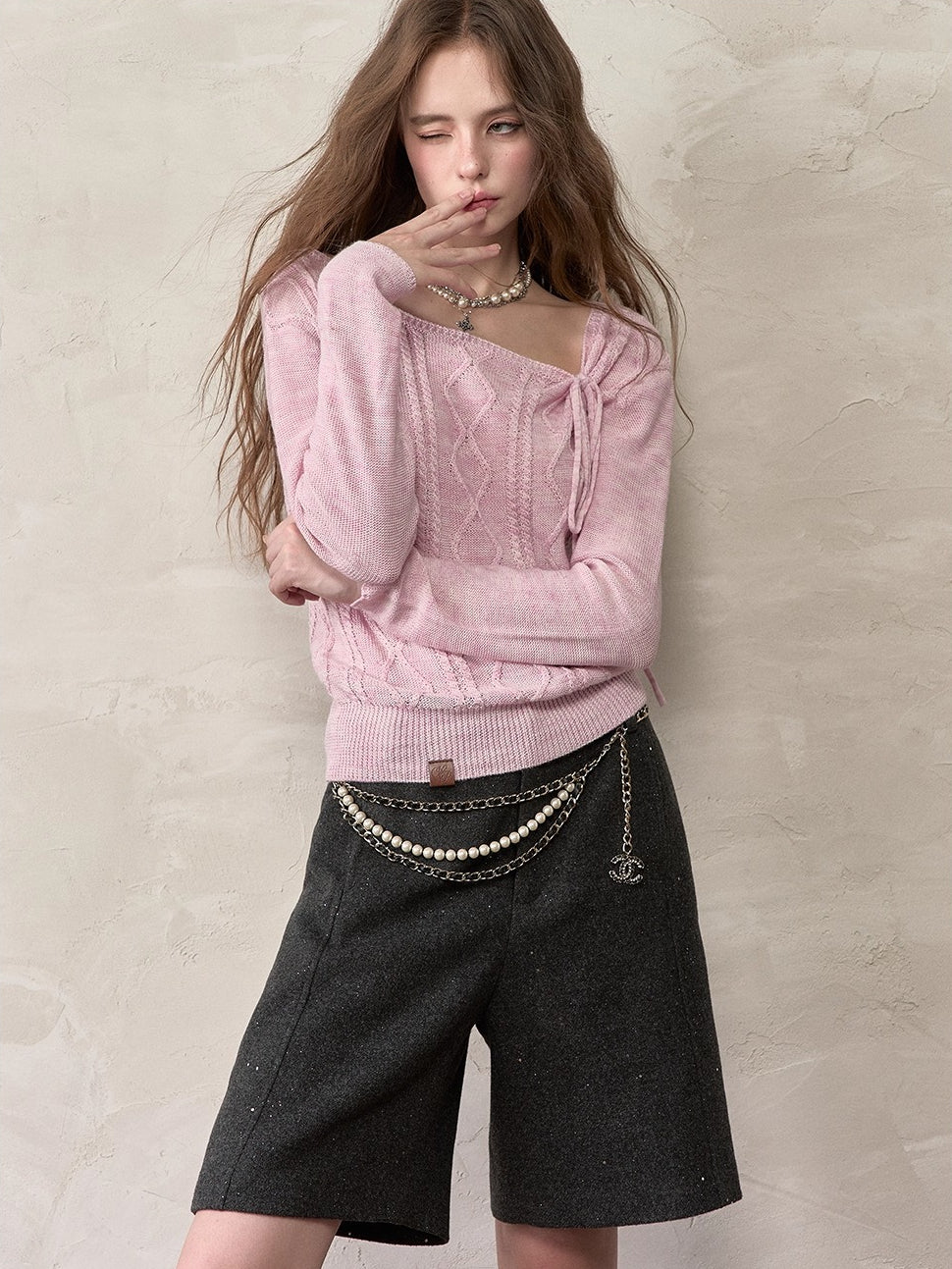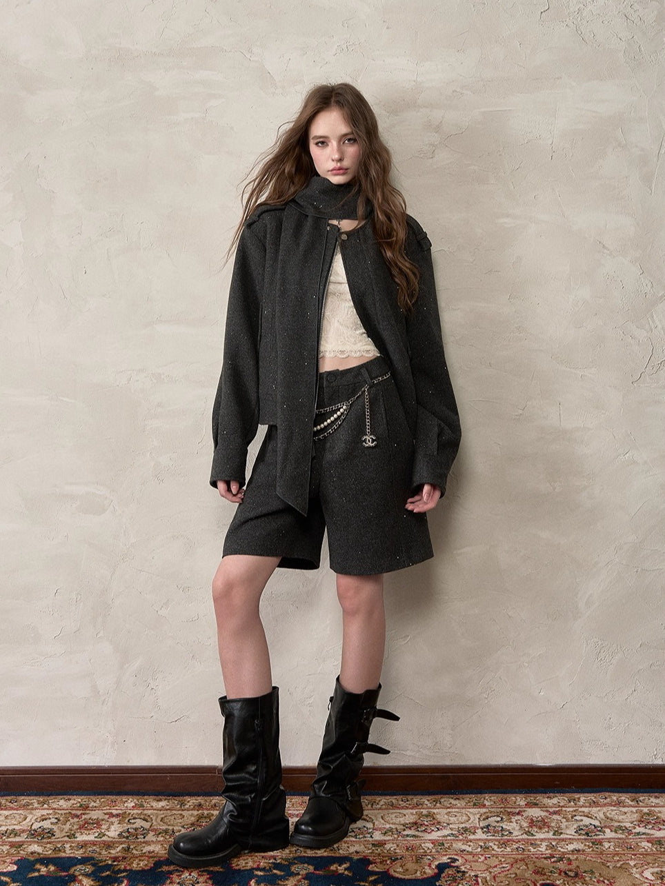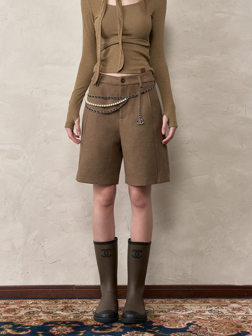 Designed with a relaxed silhouette, these mid-length shorts feature irregular silver speckle embellishments that add a sparkling accent. The clean tailored cut brings structure, while the wool blend fabric balances warmth with effortless casual charm.