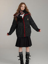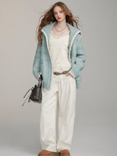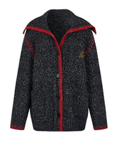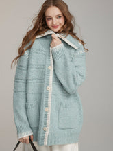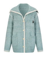 This cardigan features a navy-style lapel and decorative pockets, adding a sense of volume and structure. The fabric is soft and comfortable, with a double-layered construction for added warmth and style. The detailed edges provide a casual and sophisticated look.