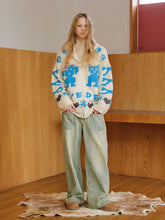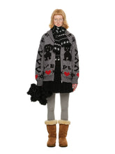 This vintage chunky knit cardigan features a bold jacquard pattern with a cozy oversized fit. Perfect for adding warmth to any outfit during colder months, the unisex design is available in S and M sizes.