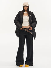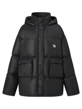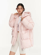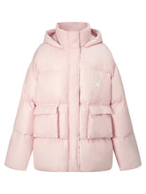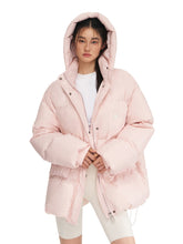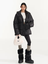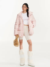 This mid-length white duck down jacket features a loose and comfortable fit. The stand-up collar paired with a hood not only enhances warmth but also frames the face, creating a visually smaller face. The jacket provides excellent coverage and is made of high-quality 100% nylon fabric for a sleek finish.