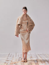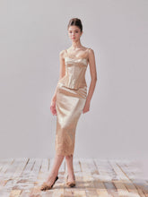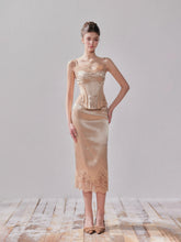 This satin corset and matching skirt set captures refined sensuality through intricate lace embroidery and a structured fit. The corset features boned seams that shape the waist while delicate lace detailing accentuates the neckline and hem. The high-waist skirt flows naturally to elongate the legs, balancing romance and strength. Crafted entirely from satin with a soft sheen, it offers a smooth, sculpted silhouette perfect for evening occasions and elegant layering.